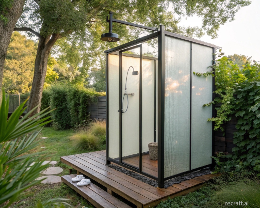 Представление о даче разное: у одних это вагончик с душем из бензобака, у других – роскошный коттедж или загородный дом со всеми удобствами. Второй вариант не рассматриваем, уделим внимание первому. Скромная дача – не всегда предполагает примитивно обустроенную душевую кабинку, особенно если она выполнена из поликарбоната. Единица материала стоит в пределах 1 300 рублей (при толщине 4 мм).