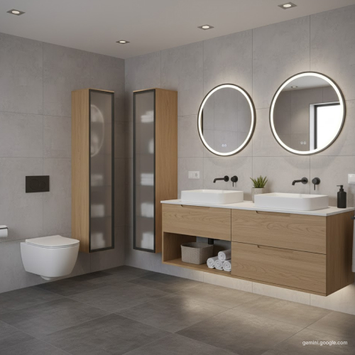 - В ванных комнатах вся мебель должна быть изготовлена из качественного, влагостойкого материала. Только так она выдержит механические нагрузки с сохранением эстетических свойств. Не стоит опускать из вида и фурнитуру, качество направляющих, ручек, крючков, петель.