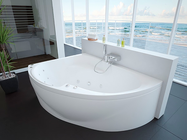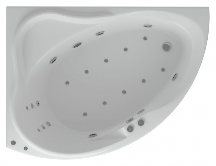 Ванна имеет асимметричную геометрию, оптимизированную для установки в левый угол помещения. Внутренняя чаша оборудована анатомической спинкой и подголовником, что способствует комфортному положению тела. Высота бортов и глубина рассчитаны с учетом гидромассажного использования.