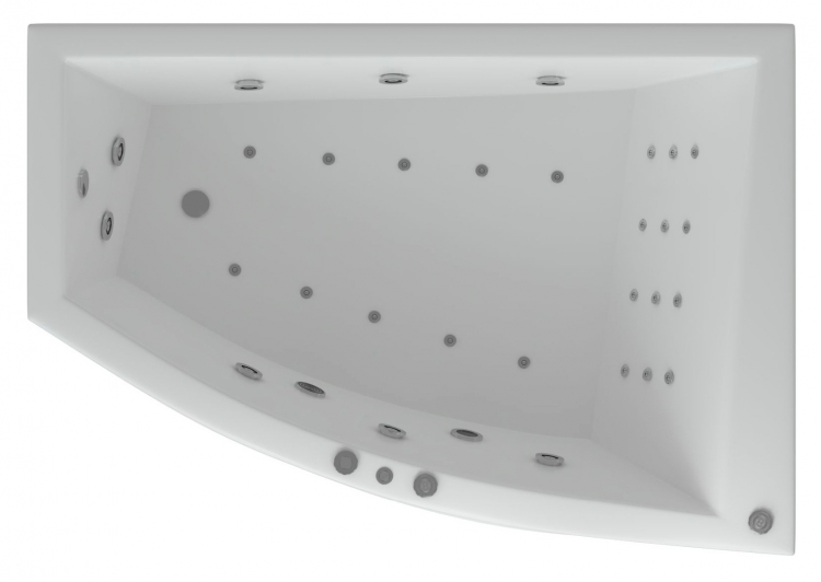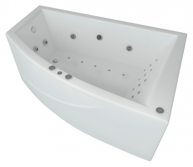 Каркас обеспечивает надежную фиксацию ванны и равномерное распределение нагрузки. Благодаря этому исключается деформация чаши при интенсивной эксплуатации. Асимметричная форма подходит для помещений нестандартной планировки, позволяя рационально использовать площадь.