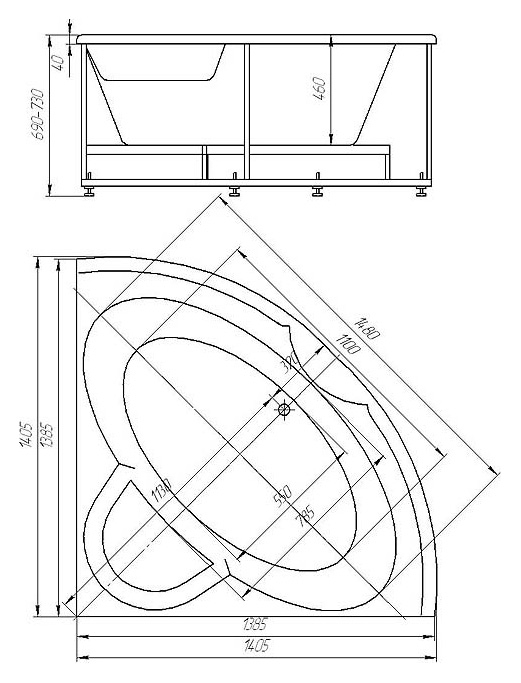 Акриловая ванна Акватек Поларис–1 имеет равностороннюю угловую форму, что обеспечивает рациональное использование пространства в санузле. Длина и ширина изделия составляют по 138,5 см, высота вместе с опорами — 73 см, а вместимость — 220 литров. Геометрия ванны позволяет удобно разместиться двум пользователям одновременно. Форма и габариты подходят для установки в стандартные угловые зоны, при этом фронтальный экран входит в комплект, упрощая монтаж и защиту конструкции.