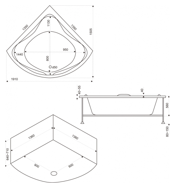 Акриловая ванна Bas «Риола» 135×135 см предназначена для установки в угол помещения и выполнена в форме четверти круга. Изделие производится из листового акрила толщиной 0,6 см, что обеспечивает устойчивость к деформациям и сохранение первоначального внешнего вида на протяжении всего срока службы. Глянцевая поверхность белого цвета отличается гладкостью и проста в уходе, не впитывает загрязнения и не желтеет со временем. Высота чаши вместе с опорами достигает 68 см. Перелив находится по центру, что облегчает отвод воды. Диаметр сливного отверстия составляет 5,2 см, стандартный для подключения к большинству современных систем. Каркас металлический, снабжен регулируемыми ножками с диапазоном изменения высоты от 8 до 15 см, что позволяет компенсировать неровности пола и выставить оптимальное положение ванны.