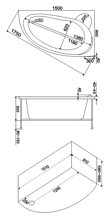 Размеры изделия: 1500 × 900 × 500 мм. Материал — сантехнический акрил. Форма — асимметричная. Объем воды — 200 л, глубина по центру — 440 мм, высота экрана — 580 мм.