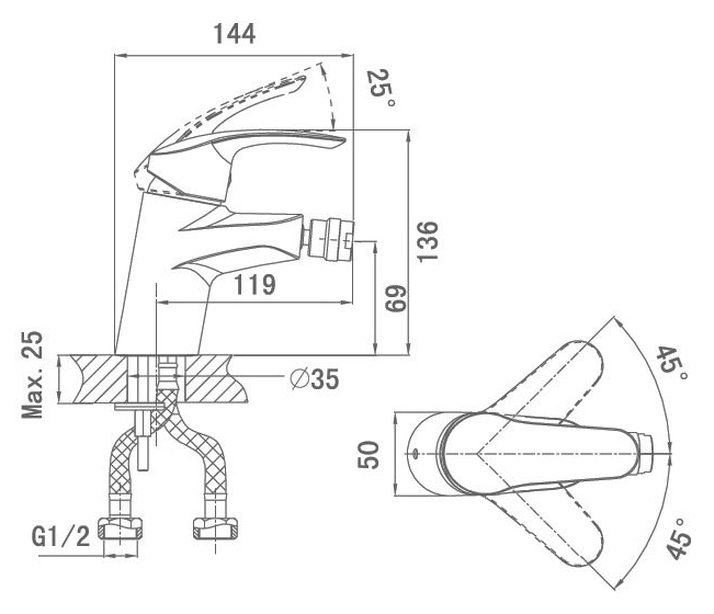 Комплект поставки включает: смеситель, гибкие подводки длиной 300 мм, декоративную накладку, крепежные элементы и уплотнители. Длина гибких шлангов позволяет установку при расстоянии между осями подводок 100-150 мм.