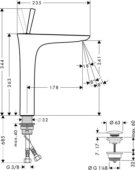 - состоит из: однорычажный смеситель для раковины, слив/перелив