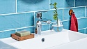 Cмеситель для умывальника. Двухкомпонентная прочная рукоятка обеспечивает удобство использования. Встроенные опции ограничения температуры и напора воды. F = Гибкая подводка<br>