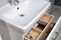 Тумбы АМЕРИНА Н устанавливаются на ножки, имеют 2 внешних ящика, а за верхним скрывается еще один – скрытый встроенный ящик. Внешние ящики установлены на направляющие нижнего крепежа, обеспечивающие жесткое и надежное крепление и плавный ход. В направляющие встроены доводчики. Дополнительно организовано нижнее подключение труб водоснабжения и канализации.