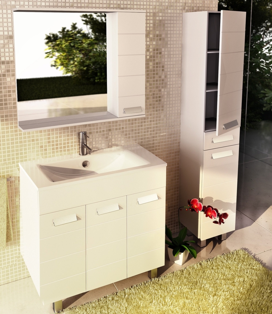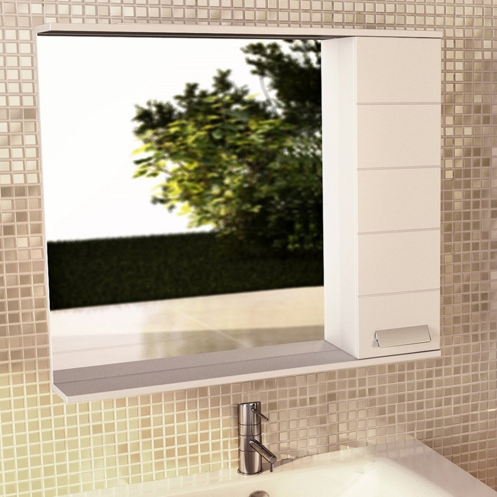 Габаритные параметры модели: ширина 90 см, высота 78,6 см, глубина 15,4 см. Прямоугольная форма корпуса подходит для большинства ванных комнат, включая помещения с ограниченной площадью. Конструкция предусматривает полки и дверцы, что позволяет хранить средства гигиены, косметику и бытовые принадлежности в закрытом или открытом доступе.