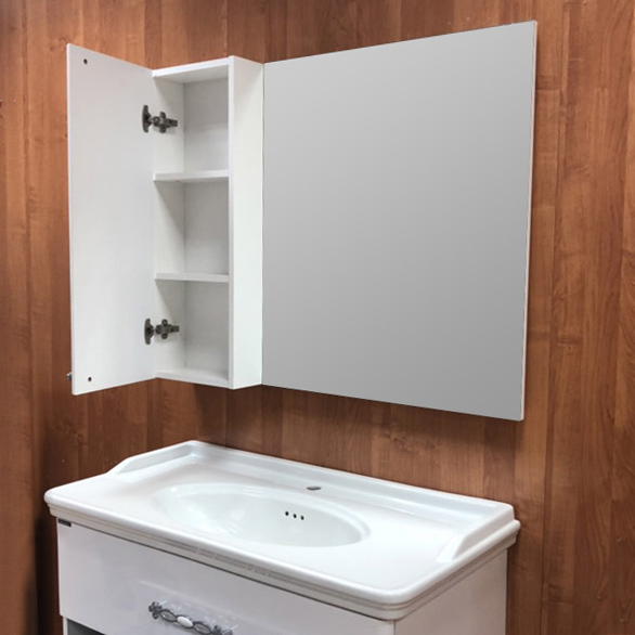 Корпус шкафа изготовлен из ДСП с глянцевым ламинатом, что повышает устойчивость к деформации и сохраняет первоначальный внешний вид при ежедневной эксплуатации. Фасад выполнен из МДФ с покрытием эмалью, что делает поверхность гладкой и удобной для очистки. Встроенное зеркало закреплено надежными креплениями, исключающими смещение и обеспечивающими безопасность при использовании. Внутреннее пространство оборудовано дверцами, за которыми находятся отделения для хранения. Такая система позволяет организовать хранение средств гигиены, косметики, бытовой химии и аксессуаров. Хромированная фурнитура устойчива к коррозии, сохраняет внешний вид даже при регулярном контакте с влагой и не требует специального обслуживания.