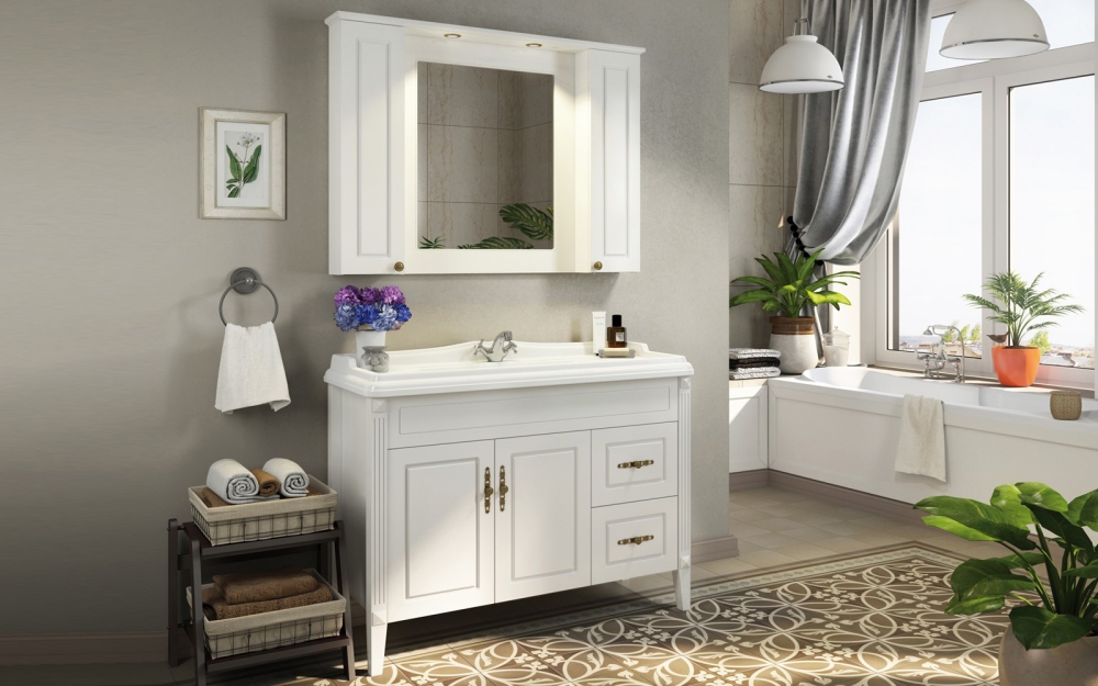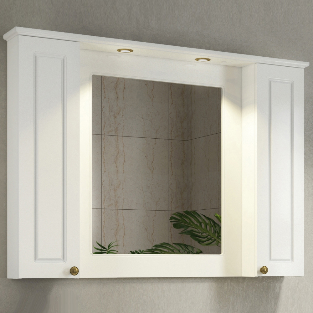 В конструкции предусмотрены закрытые отделения с дверцами, позволяющие разместить средства гигиены и косметику. Встроенное зеркало занимает большую часть фасадной поверхности и дает возможность полноценного использования при уходе за собой. Подсветка встроена в верхнюю часть и равномерно освещает зону перед шкафом. Управление светом выполняется при помощи электровыключателя, размещенного на корпусе.