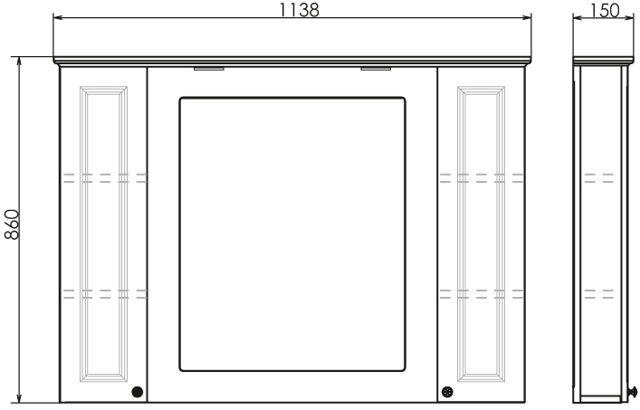 Габариты составляют 113,8 см по ширине, 86 см по высоте и 15 см по глубине. Размеры рассчитаны для установки в санузлах средней и большой площади, обеспечивая достаточную площадь хранения при сохранении компактности.