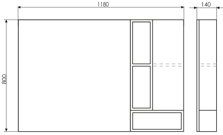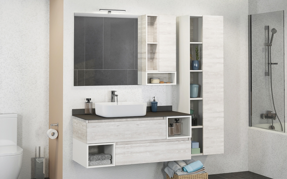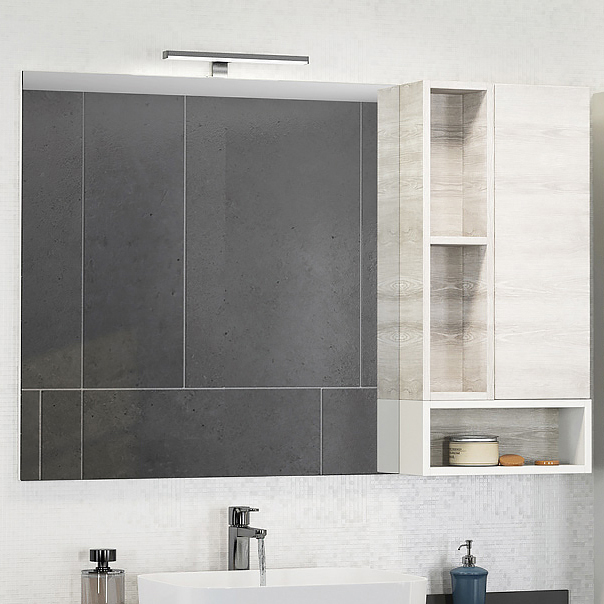 Зеркальная панель совмещена с системой хранения, состоящей из полок и закрытых секций. Конструкция оснащена дверцами с нажимным механизмом открывания. Отсутствие ручек облегчает уход за фасадом и делает использование удобным. Внутренние отделения позволяют хранить средства личной гигиены, косметику и аксессуары, которые должны быть защищены от влаги.