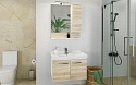 Внутреннее пространство оборудовано полками и дверцами, что позволяет рационально организовать хранение косметики, гигиенических принадлежностей и бытовых мелочей. Дверцы шкафа скрывают предметы от посторонних глаз, а открытая полка под зеркалом обеспечивает быстрый доступ. Модульная система хранения создаёт удобство при размещении предметов, поддерживая порядок и минимизируя визуальный беспорядок. Сочетание белого цвета корпуса и светлого оттенка дерева фасада обеспечивает нейтральное оформление, подходящее под разные стилистические решения интерьера.