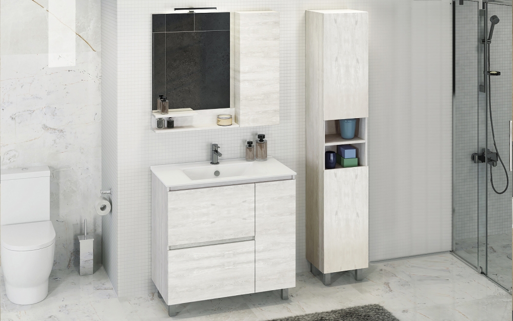 Внутреннее пространство разделено полками, позволяющими удобно организовать хранение косметики, средств гигиены и бытовых принадлежностей. Дверцы обеспечивают защиту от попадания влаги и пыли. Благодаря использованию ламинированного покрытия все поверхности легко очищаются и сохраняют внешний вид на протяжении всего срока службы.