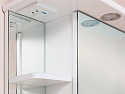 Особенностью модели является комбинированная организация пространства, сочетающая открытые полки слева и закрытую зону хранения за зеркальной дверцей справа. Открытые полки обеспечивают быстрый доступ к часто используемым предметам, в то время как внутреннее пространство шкафа, разделенное полкой, предназначено для систематического хранения бытовых принадлежностей. Врезной светодиодный светильник создает комфортное освещение в зоне умывальника, а встроенная розетка добавляет практичности в повседневном использовании. Система плавного закрывания гарантирует бесшумную работу дверцы, сохраняя спокойную атмосферу в помещении.
