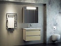 Особенностью модели является современная светодиодная подсветка, расположенная в верхней части шкафа. Мощность освещения составляет 12 Вт, что обеспечивает равномерное и достаточное освещение зоны умывальника без резких бликов. Механический выключатель гарантирует простое и надежное управление подсветкой. Стеклянные фасады с зеркальным покрытием не только выполняют свою основную функцию, но и способствуют визуальному расширению пространства, создавая ощущение простора даже в компактных помещениях.