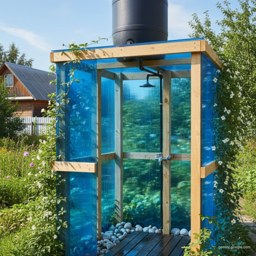 Представление о даче разное: у одних это вагончик с душем из бензобака, у других – роскошный коттедж или загородный дом со всеми удобствами. Второй вариант не рассматриваем, уделим внимание первому. Скромная дача – не всегда предполагает примитивно обустроенную душевую кабинку, особенно если она выполнена из поликарбоната. Единица материала стоит в пределах 1 300 рублей (при толщине 4 мм).
