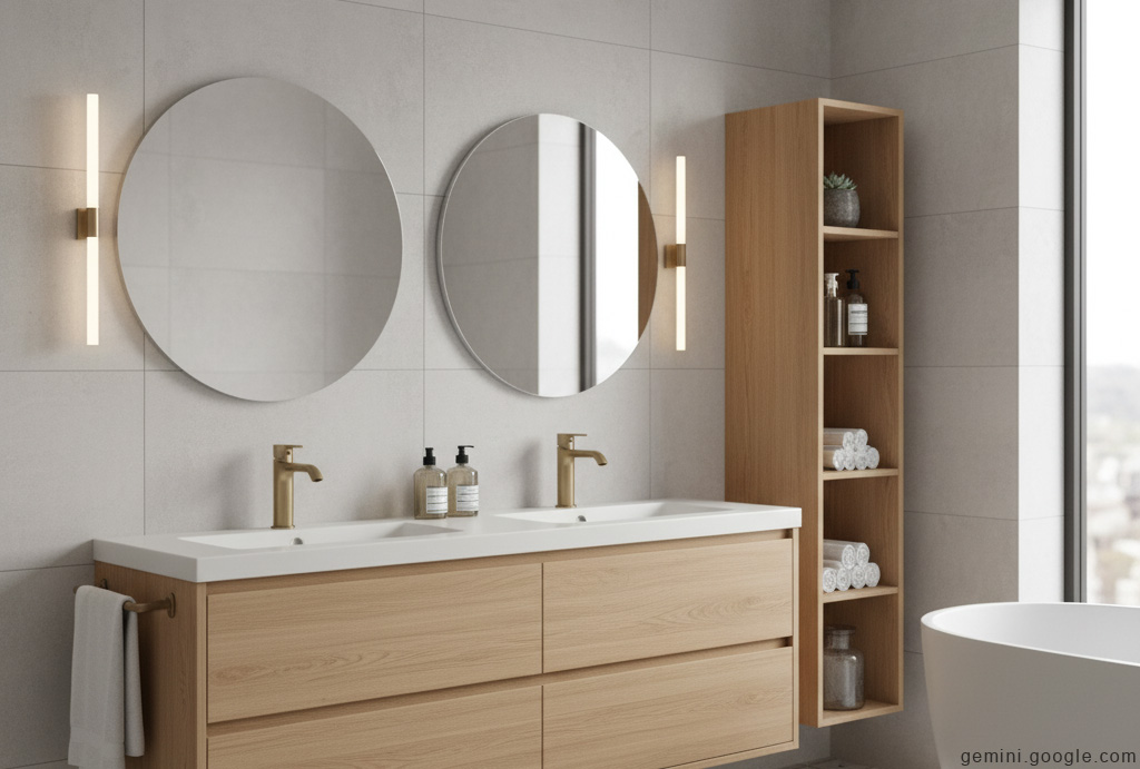- напольные, подвесные тумбы с раковинами и без (можно установить одну с мойкой, другую без или сделать умывальник отдельностоящим);