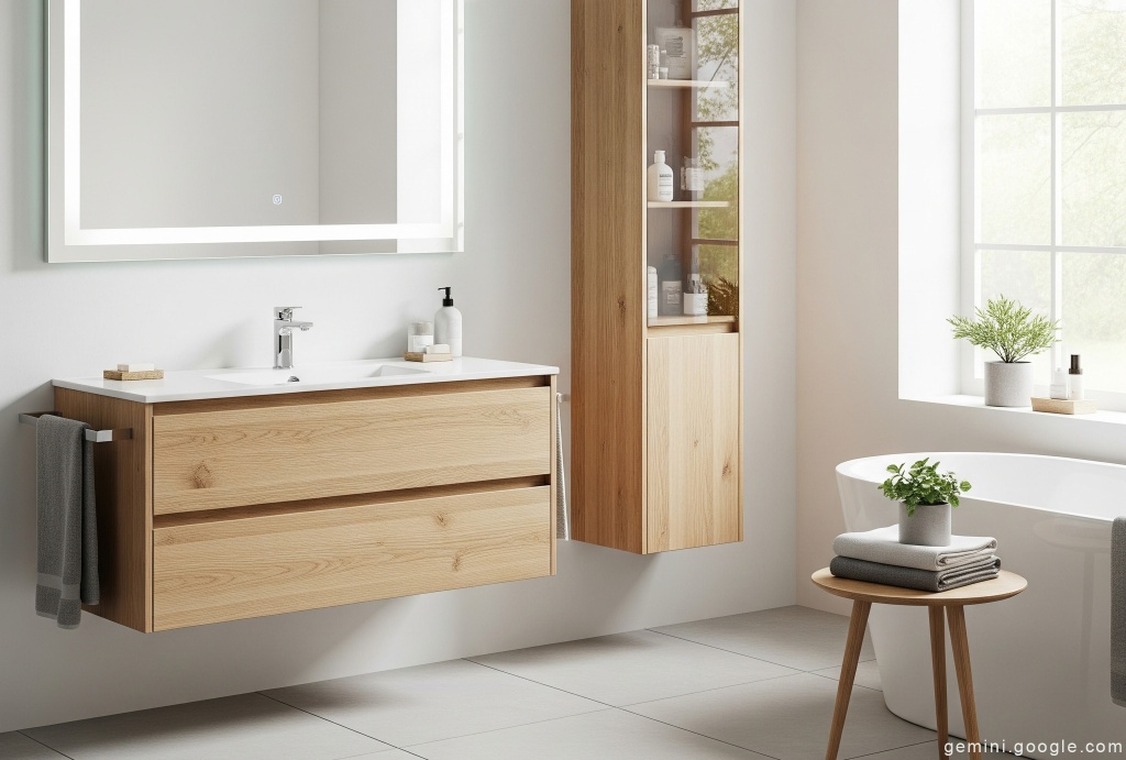Хороший гарнитур не перегрузит пространство и сделает его завершенным. Стандартно он включает в себя тумбу с раковиной, зеркало, узкий высокий пенал и/или подвесной шкаф, но возможны другие варианты. Главное помнить о принципах гармоничности и не загромождать маленькие комнаты.
