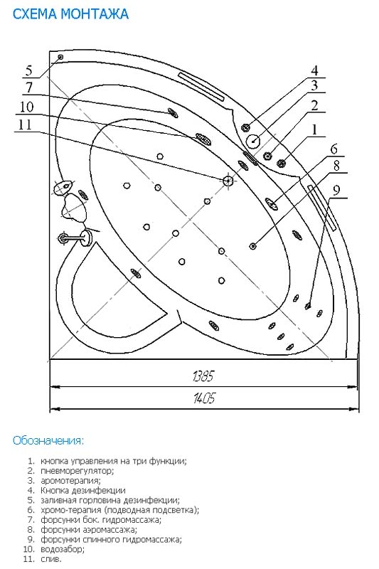 Каркас изделия обеспечивает стабильность и долговечность. Комплект опор гарантирует надежную фиксацию на поверхности, предотвращает смещение и деформацию в процессе эксплуатации. Слив-перелив с установленными элементами обеспечивает безопасный отвод воды и предотвращает перелив. Все комплектующие полностью совместимы с конструкцией ванны и поставляются производителем.