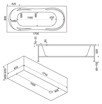 Ванна подходит для установки встраиваемым или приставным способом. Подключение осуществляется через стандартный слив-перелив диаметром 5,2 см, приобретаемый отдельно. Конструкция предусматривает удобный доступ к коммуникациям и обеспечивает простоту монтажа даже в ограниченных пространствах. Универсальные габариты 170x80 см позволяют интегрировать модель в интерьеры помещений с различной планировкой. Дополнительно предлагаются ванны аналогичной длины для подбора оптимальной ширины и формы. Модель совместима с аксессуарами для повышения безопасности и комфорта, что делает её функциональным и практичным решением для санузлов современного типа.