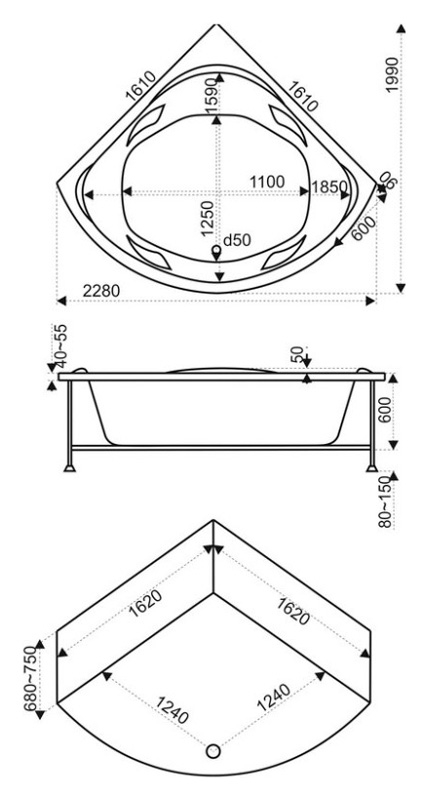 Установка ванны возможна только в угловом положении, что обеспечивает оптимальное распределение нагрузки на каркас и минимизирует риск протечек. Подключение слива по центру упрощает монтаж и обеспечивает универсальность при проектировании водопроводной системы. Поверхность легко поддерживать в чистоте, антискользящее покрытие уменьшает вероятность травм. Конструкция не требует дополнительного усиления, обеспечивает долговечность и стабильность формы. Ванна совместима с дополнительными аксессуарами, включая ручки для безопасного входа и выхода, а также декоративные панели при желании владельца.
