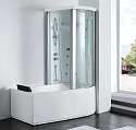 Стандартная комплектация включает: акриловую чашу, каркасную систему, гидромассажный блок с шестью форсунками, смеситель с изливом и верхним душем, лейку, подголовник, зеркало, полочку, фронтальный и боковой экраны. Все необходимые крепежные элементы и соединительные компоненты присутствуют в поставке.