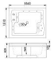 Прямоугольная форма чаши с правосторонним исполнением обеспечивает функциональное использование пространства. Каркасная система включает стальные усилители и регулируемые опорные элементы. Гидромассажная система состоит из 17 хромированных форсунок и насоса мощностью 1500 Вт.