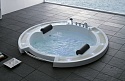 Круглая форма чаши обеспечивает равномерное распределение объема. Каркасная система включает стальные усилители и регулируемые опорные элементы. Модель оснащена системой гидромассажа с 16 хромированными форсунками и насосом мощностью 1500 Вт.