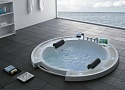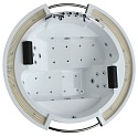 Круглая форма чаши обеспечивает равномерное распределение объема воды. Модель оборудована системой гидромассажа с 16 форсунками хромированного исполнения и системой аэромассажа с 16 дополнительными форсунками. Мощность насосного оборудования составляет 1500 Вт.