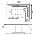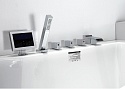 Базовая комплектация включает каркасную систему для установки, сливно-переливное оборудование и подголовник. Модель укомплектована смесителем с изливом, душевой лейкой и съемной панелью управления. В конструкции предусмотрены ручки для удобства использования.