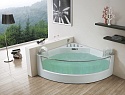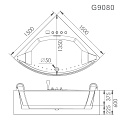 Акриловая ванна Gemy G9080 представляет собой угловую модель в форме четверти круга, предназначенную для установки в помещении. Габаритные размеры составляют 150×150 см, высота с опорой — 60 см, объем — 200 литров, глубина — 40 см. Конструкция рассчитана на одновременное использование двумя людьми. Изделие произведено в Китае из акрилового материала толщиной 0,5 см.