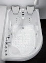 Угловая асимметричная форма чаши оптимизирована для установки в угол помещения. Правосторонняя модификация предусматривает специфическое расположение функциональных элементов. Каркасная система включает стальные усилители и регулируемые опорные элементы. Толщина акрилового слоя усилена дополнительным армированием.