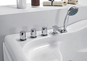 Полная комплектация включает смеситель с изливом, душевую лейку, съемную панель управления и подголовник. Система гидромассажа имеет 11 форсунок хромированного исполнения. Мощность насосного оборудования составляет 1100 Вт с защитой от перегрева и сухого пуска.