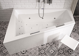 Габариты ванны составляют 1800x1300 мм, глубина чаши 500 мм. Общий объём воды — 395 литров. Ванна правосторонняя, что необходимо учитывать при планировке ванной комнаты и подключении к сантехническим коммуникациям. Максимальная допустимая нагрузка превышает 300 кг.