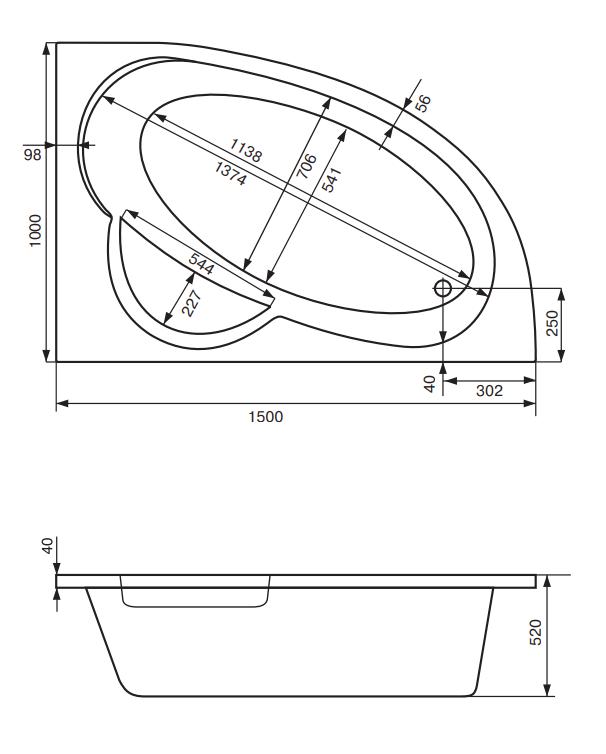 Асимметричная угловая форма со встроенным подголовником выделяет модель среди стандартных предложений, обеспечивая повышенный комфорт использования. Конструкция предусматривает пристенный монтаж с использованием регулируемых опор, позволяющих точно выровнять изделие на разных поверхностях. Стандартное расположение сливного отверстия диаметром 52 мм гарантирует совместимость с большинством систем.