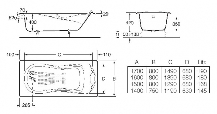 Размеры ванны — 160 см в длину, 70 см в ширину и 44,5 см в глубину — обеспечивают простор для комфортного принятия ванны даже пользователям с высоким ростом. Объем ванны составляет 196 литров, что позволяет полностью погрузиться и насладиться водными процедурами. Прямоугольная форма изделия способствует рациональному размещению в ванной комнате и удобной пристенной установке.