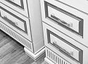 Ценителям роскошных интерьеров ванных комнат придется по вкусу коллекция мебели Opadiris «Оникс». Филенчатый фасад шкафа-пенала с белоснежным глянцевым покрытием декорирован серебряной патиной. Поверхность не истирается со временем и легко очищается. Сияющие в тон патине глянцевые ручки и фигурные ножки подчеркивают неповторимый стиль. Шкаф отличается вместительностью, система хранения представлена двумя выдвижными ящиками и секцией за распашным фасадом. Мебель изготовлена из влагостойкой МДФ с эмалевым покрытием, долговечна.