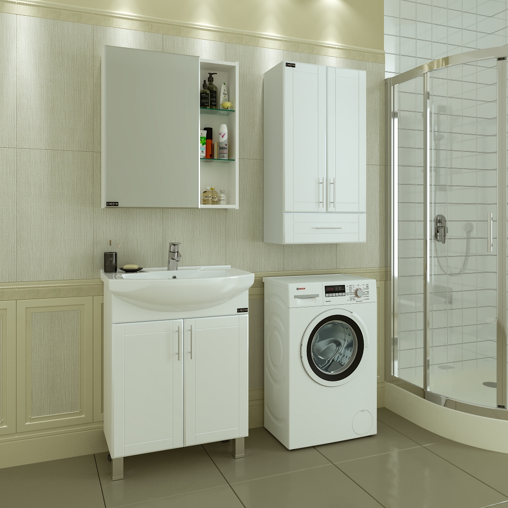 Внутреннее пространство изделия включает одну секцию с ящиком и дверцами. Ящик оснащён направляющими, обеспечивающими плавное скольжение и бесшумное открывание, а дверцы работают на хромированных петлях, обеспечивая долговечность и стабильность конструкции. Такая конфигурация позволяет компактно размещать средства гигиены, косметические принадлежности, мелкую бытовую химию и другие предметы, которые должны быть всегда под рукой. При этом визуальная чистота поддерживается за счёт скрытого хранения предметов за дверцами.