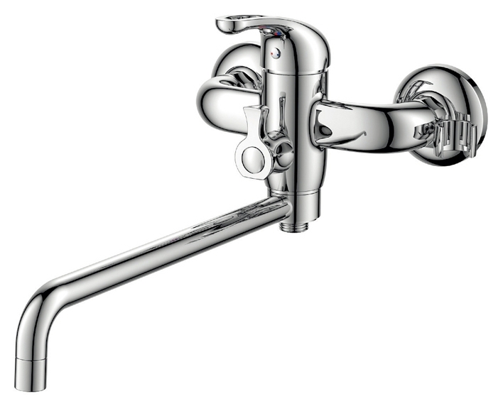 Смеситель для ванны D&K Eucharius Rhein с длинным поворотным изливом и душевым гарнитуром, однорычажный, на два отверстия для монтажа на стену.