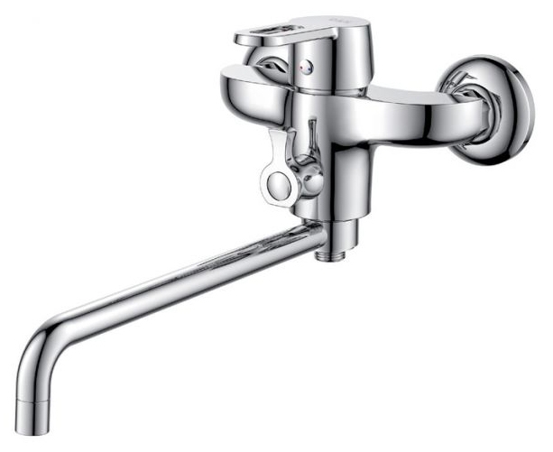 Однорычажный настенный смеситель для ванны D&K Bayern Hamburg универсальный, с поворотным длинным изливом, в комплекте с душевым гарнитуром.