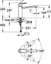 Смеситель может поворачиваться в диапазоне 140 градусов. Такой диапазон вращения позволяет с большим удобством пользоваться мойками с двумя чашами. Система быстрого монтажа и понятная инструкция позволит вам установить смеситель без особых сложностей и достаточно быстро.<br>