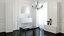 Фурнитура выполнена из хрома и кристалла, обеспечивая надежное открытие дверок и долговременное сохранение эстетики. Цвет мебели — белый глянец, фасад также покрыт эмалью, что облегчает уход и сохраняет блеск поверхности. Система хранения включает дверки, предоставляя закрытое пространство для размещения аксессуаров, моющих средств и полотенец.