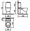 Длина изделия составляет 64 см, ширина — 34 см, высота — 77 см. Направление выпуска можно выбрать горизонтальное (в стену) или вертикальное (в пол), что обеспечивает совместимость с разными схемами канализации. Тип напольный, установка не требует дополнительных систем инсталляции. Организация смыва реализована через душевой слив с технологией «воронка-водоворот», обеспечивающую эффективное удаление отходов. Полочка в чаше отсутствует, что облегчает очистку.