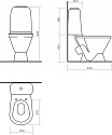 Унитаз имеет следующие размеры: длина — 64 см, ширина — 35 см, высота — 80,5 см. Напольная конструкция позволяет установить изделие на стандартное покрытие без усиления основания. Полочка внутри чаши отсутствует, что упрощает очистку и предотвращает скапливание загрязнений. Данный вариант подходит для бытового применения и не требует укороченной модели. Сливной бачок фиксируется поверх чаши, обеспечивая надежность крепления и долговечность эксплуатации.