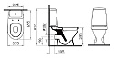Напольный компакт с горизонтальным выпуском, длина 65,5 см, ширина 35,5 см, высота 83 см. Высота чаши — 39,5 см. Материал корпуса — фарфор, сиденья — дюропласт. Режим слива воды — две кнопки с экономичным расходом. Система антивсплеск исключает разбрызгивание. Механизм с микролифтом обеспечивает плавное закрытие крышки. Цвет изделия белый, форма овальная, бачок входит в комплект.