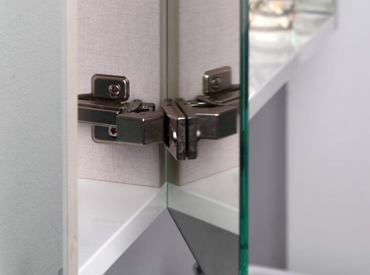 Внутренняя организация шкафа демонстрирует внимание к деталям и удобству использования. Четыре стеклянные полки создают многоуровневую систему хранения, позволяющую рационально распределить банные принадлежности и косметику. Фасады из ударопрочного зеркала-триплекса сочетают в себе эстетическую привлекательность и повышенную безопасность эксплуатации. Особенностью модели является применение петель BLUM с системой плавного закрывания, обеспечивающих бесшумную и плавную работу дверц. Наличие встроенного светильника и розетки добавляет шкафу бытовую универсальность, создавая комфортные условия для использования зеркала и подключения электроприборов.