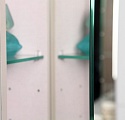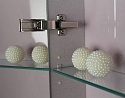 Внутренняя структура шкафа демонстрирует внимательный подход к организации хранения. Четыре стеклянные полки создают многоуровневую систему, позволяющую рационально распределить банные принадлежности и косметику. Текстурированная поверхность внутренних деталей из влагостойкого ДСП добавляет интерьеру тактильную выразительность и визуальную глубину. Модель оснащена встроенным светильником и розеткой, что создает комфортные условия для использования зеркала и подключения электроприборов. Система плавного закрывания от производителя BLUM гарантирует бесшутную и плавную работу дверц, обеспечивая долговечность механизма и поддерживая спокойную атмосферу в помещении.