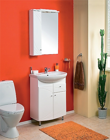 Фасад шкафа украшен изящной фрезеровкой, которая придает модели индивидуальность и эстетическую завершенность. За дверцей скрывается практичное внутреннее пространство с полкой, обеспечивающей достаточно места для хранения косметики, гигиенических принадлежностей и бытовых мелочей. Верхняя панель интегрирована с системой освещения, состоящей из двух галогеновых светильников, и розеткой для подключения электроприборов. Это решение создает комфортные условия для использования зеркала и обеспечивает необходимый функционал в зоне умывальника.