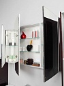 Модель оснащена встроенной подсветкой, создающей комфортное равномерное освещение в зоне умывальника. Наличие системы подогрева зеркальной поверхности не только предотвращает образование конденсата, но и способствует поддержанию оптимального микроклимата вокруг изделия. Небольшая глубина 3.6 см позволяет сохранить визуальную легкость конструкции, несмотря на значительную ширину. Подвесной монтаж подчеркивает современный характер изделия и облегчает уход за пространством под шкафом. Сочетание закругленных углов и строгих прямоугольных линий создает динамичный и гармоничный облик, соответствующий актуальным тенденциям в дизайне ванных комнат.